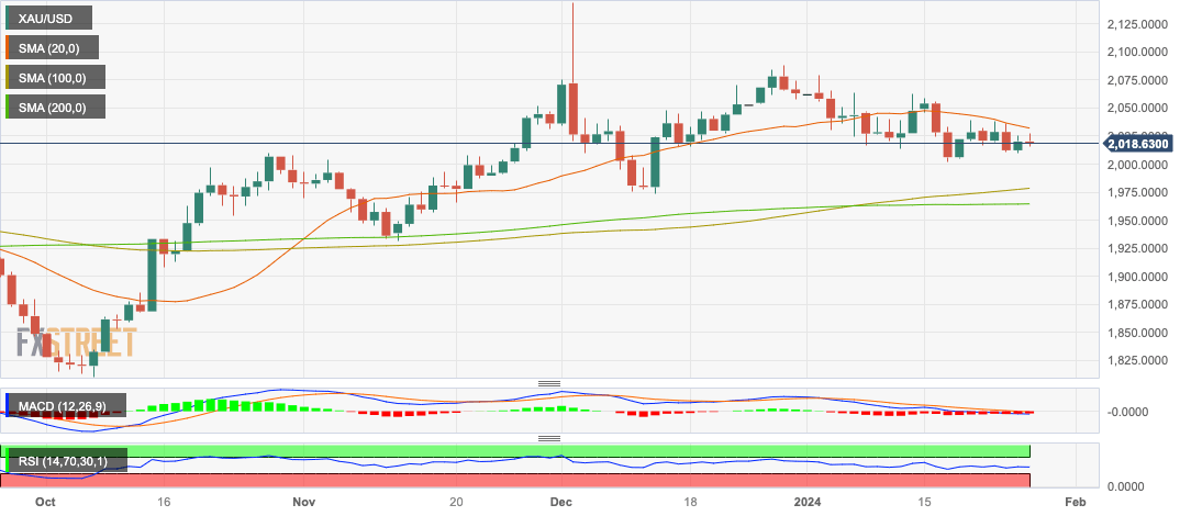 On Friday's session, the XAU/USD was seen trading at $2,018, presenting a slight decline of 0.08% and closing a 0.55% weekly loss. After reaching a level of $2,135 in December, buyers have been largely taking a pause, suggesting a neutral to a bullish outlook on the daily chart. Despite some momentum observed in the four-hour chart, the indicators remain relatively weak.