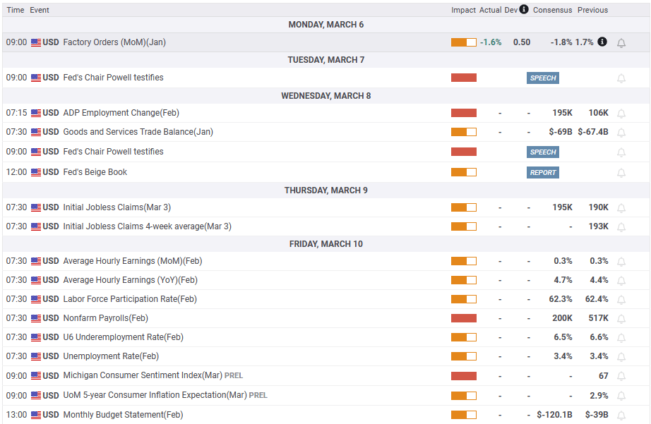 XAU/USD’s price would likely remain volatile as market participants prepared for the US Federal Reserve (Fed) Chairman Jerome Powell’s speech at the US Congress on March 7 and 8. Market participants estimate a hawkish stance, echoing some of the messages spread by his colleagues. Investors expect that Powell would reiterate the Fed’s commitment to curb inflation and emphasize the need to go higher for longer.