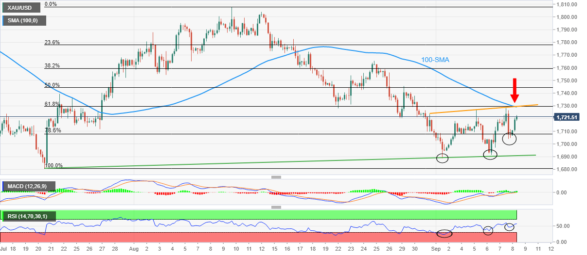 Gold price justifies the bullish RSI divergence as the bulls approach a convergence of the 100-SMA, 61.8% Fibonacci retracement level of July-August upside and a one-week-old rising trend line.