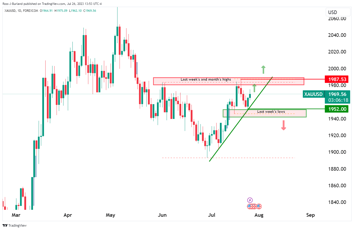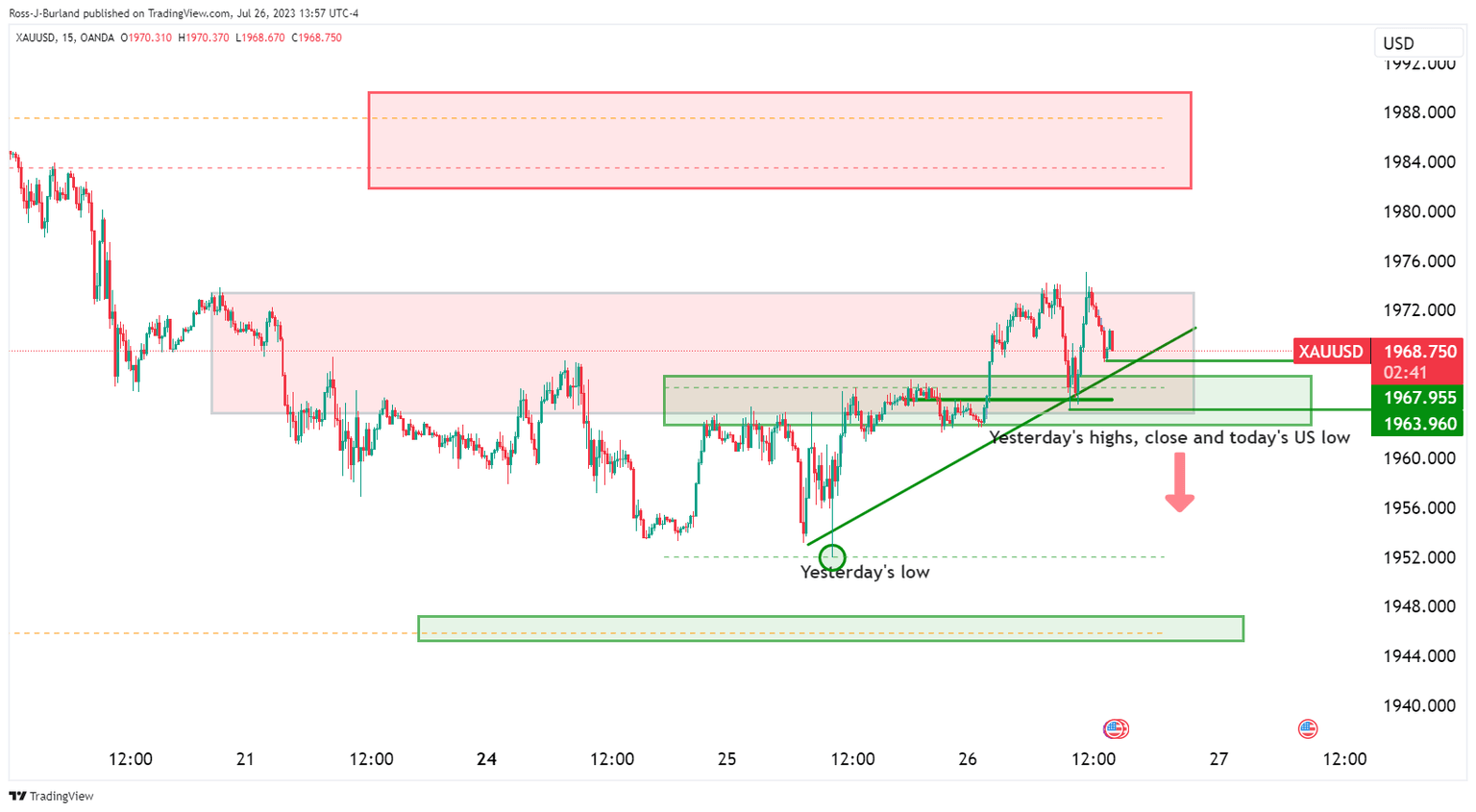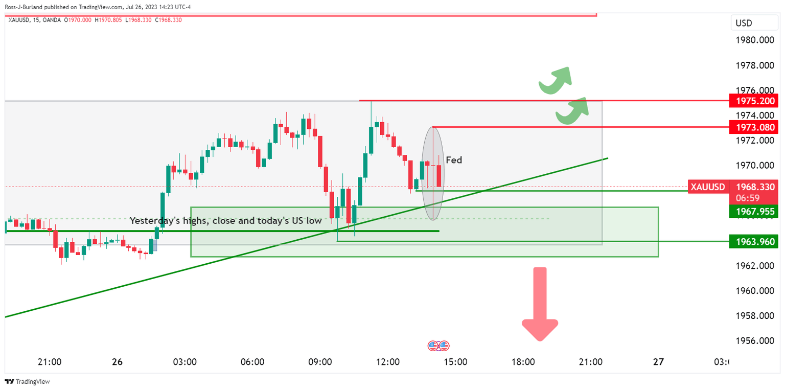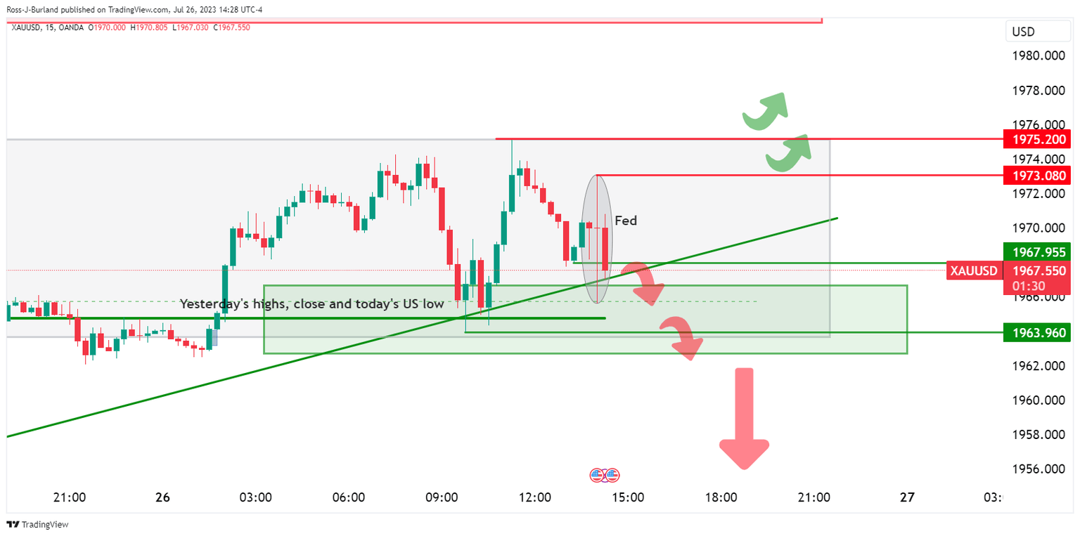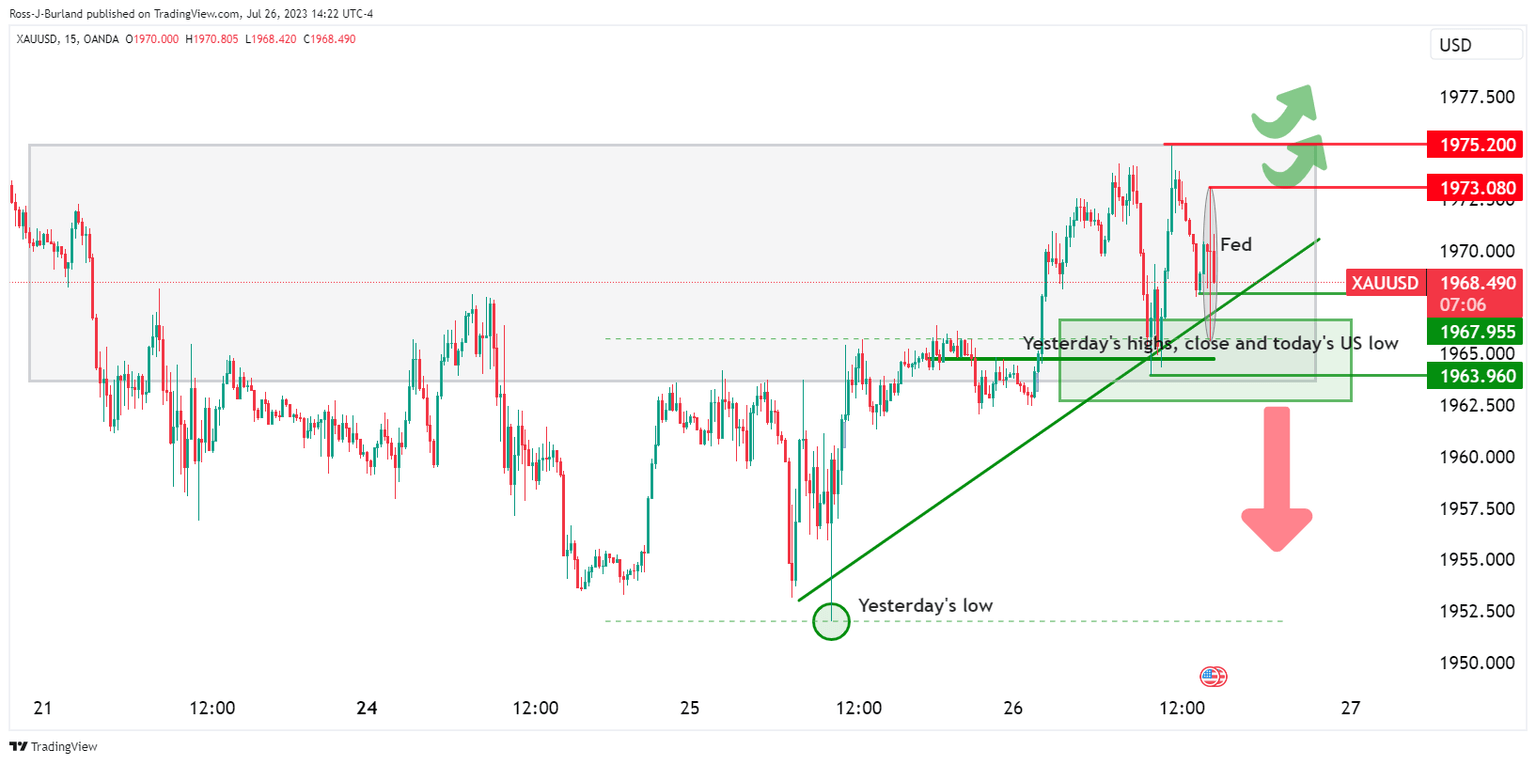 The Gold price has been whipsawed after the Federal Reserve, Fed, raised its interest rate decision by a 25 bps rate hike to 5.25-5.50%, as expected. At the time of writing, Gold is volatile between $1,973 and $1,965 so far as the market digests the statement and key points as follows: