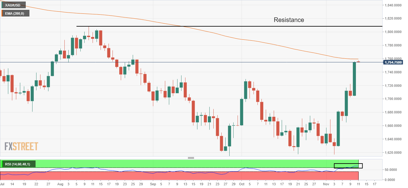 On the daily scale, the gold price is marginally far from kissing the 200-period Exponential Moving Average (EMA) at $1,758.00 for the first time in the past five months. The horizontal resistance placed from August 10 high at $1,807.93 will act as major hurdle ahead.
