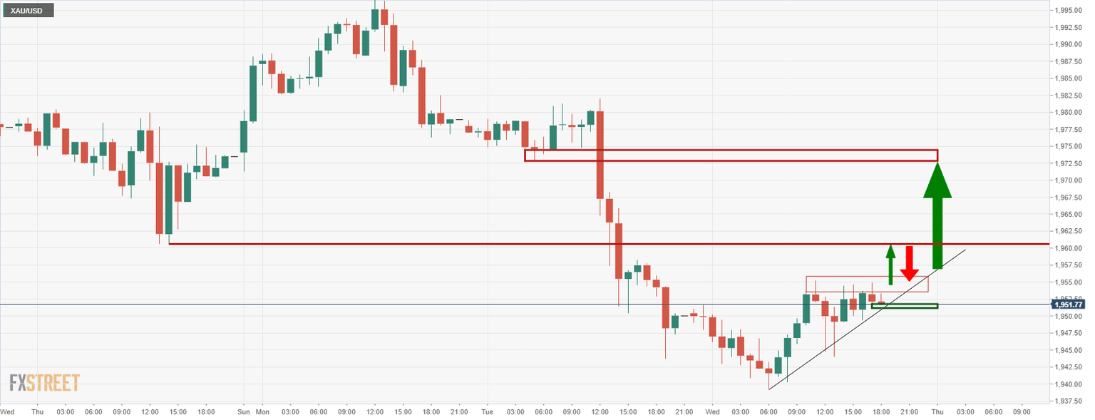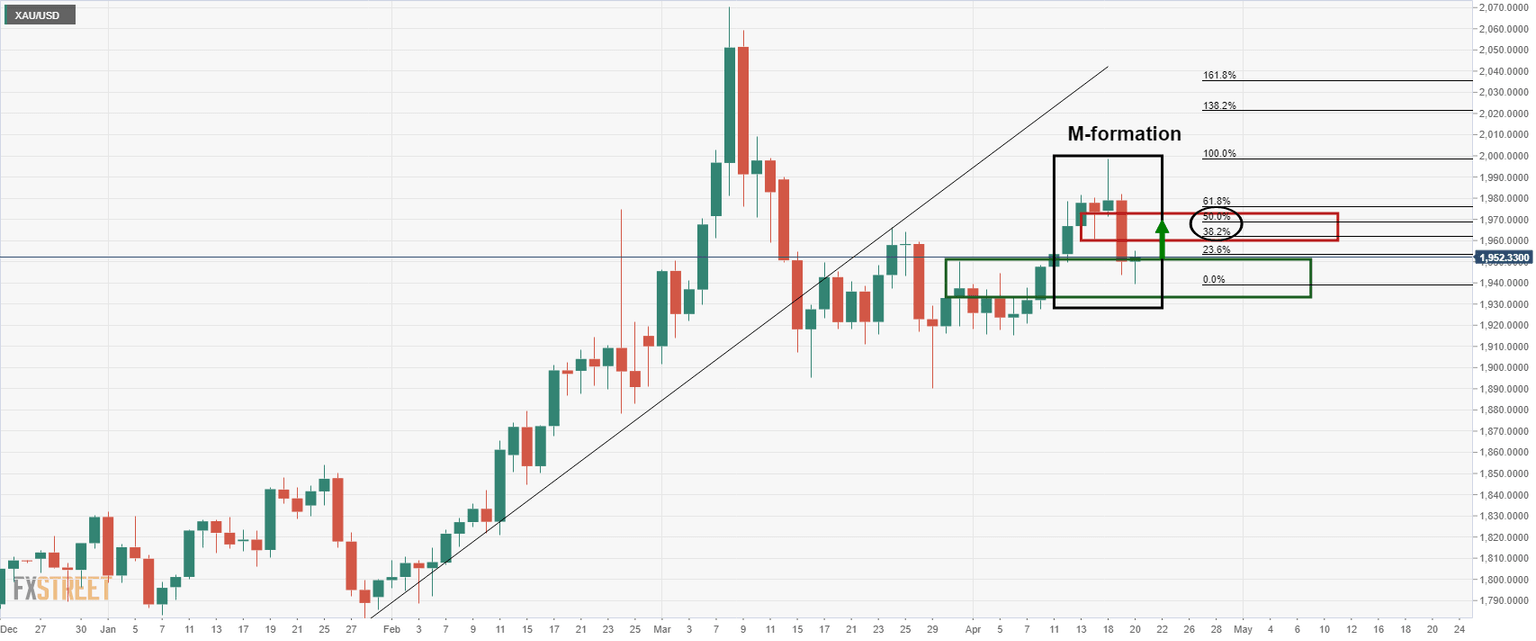 For the M-formation to play out, the bulls will note the meanwhile resistance on the hourly chart near $1,960. However, above here, the bulls will on track for the neckline near $1,973. Beyond there, a break of the April 18 highs near $2,000 will be on the cards.