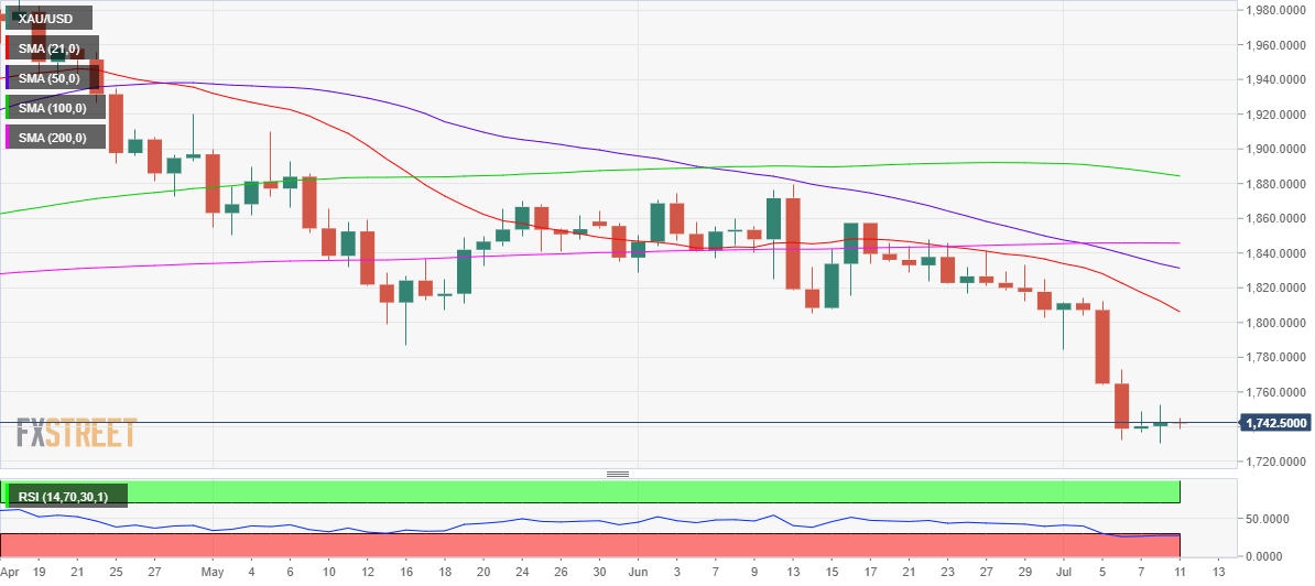 “On the upside, $1,765 (former support, static level) aligns as the first technical resistance ahead of $1,790 (former support, static level). On the downside, $1,730 (July 8 low) forms interim support ahead of $1,720 (static level) and $1,700 (psychological level),” FXStreet’s Senior Analyst, Eren Sengezer explained in his gold weekly forecast.
