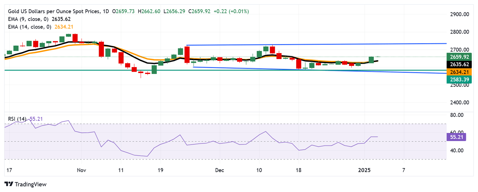 Gold price trades near $2,660.00 per troy ounce on Friday, with the daily chart signaling an emergence of a bullish bias. The metal price has climbed above the nine- and 14-day Exponential Moving Averages (EMAs), indicating a strengthening bullish momentum in the short term. Moreover, the 14-day Relative Strength Index (RSI) has risen above the 50 level, further supporting the development of a bullish bias.
