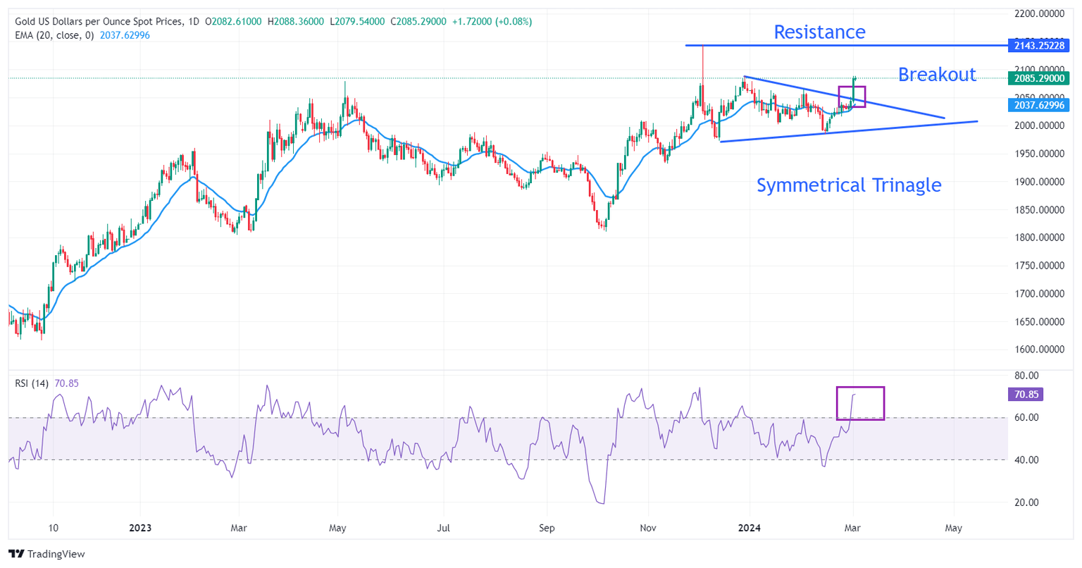 The upward-sloping 20-day Exponential Moving Average (EMA) is at $2,040, indicating strong demand in the near term.