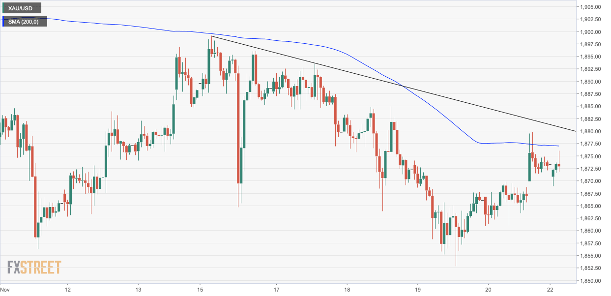 Gold is currently trading near $1,872 per ounce, having nearly tested the 200-hour Simple Moving Average (SMA) of $1,876 a few minutes before press time. The buyers failed to establish a foothold above that average on Friday.