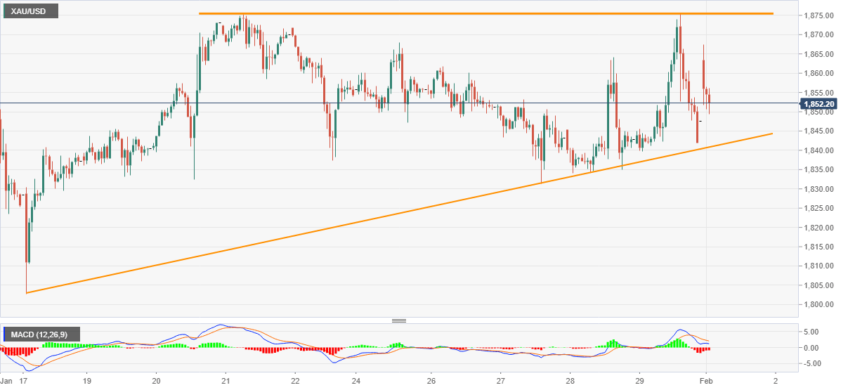 Gold drops to $1,851.39 while trimming the gains to 0.50% during Monday’s Asian session. In doing so, the yellow metal stays inside a short-term ascending triangle.
