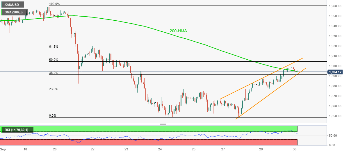 Gold prices bounce off an intraday low of $1,892.72 to $1,896.70 amid Wednesday’s Asian session. The yellow metal recently dropped after the US presidential debate questioned market sentiment. Technically, a three-day-old rising wedge formation on the hourly chart keeps sellers hopeful even as 200-HMA probes immediate downside.