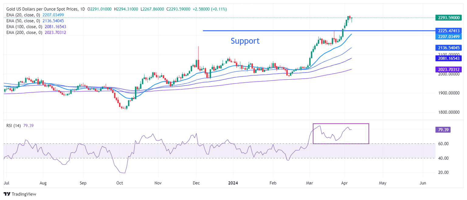 Gold price falls slightly after achieving the $2,300 milestone. The near-term demand remains unabated as all short-to-long term Exponential Moving Averages (EMAs) are sloping higher. On the downside, March 21 high at $2,223 will be a major support area for the Gold price bulls.