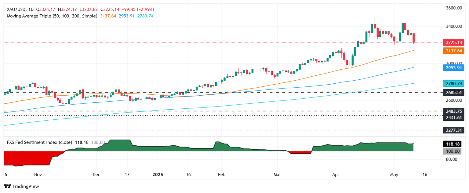 Gold price uptrend halted as the non-yielding metal is about to test the May 1 daily low of $3,202, which, once cleared, could send XAU/USD prices tumbling toward testing the 50-day Simple Moving Average (SMA) at $3,137. A breach of the latter will expose $3,100.