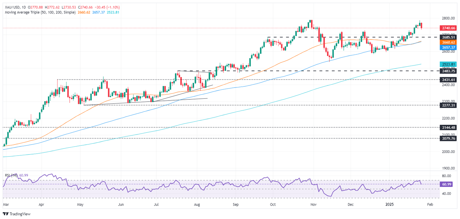 Gold price retraces and consolidates as buyers take a breather before pushing XAU/USD prices higher to challenge the record high of $2,790. In the near term, XAU/USD pullbacks below $2,750, which could pave the way to test $2,700. Once surpassed, the next stop will be the confluence of the 50 and 100-day Simple Moving Averages (SMAs) at around $2,655-$2,660. On further weakness, the $2,600 could act like a magnet.