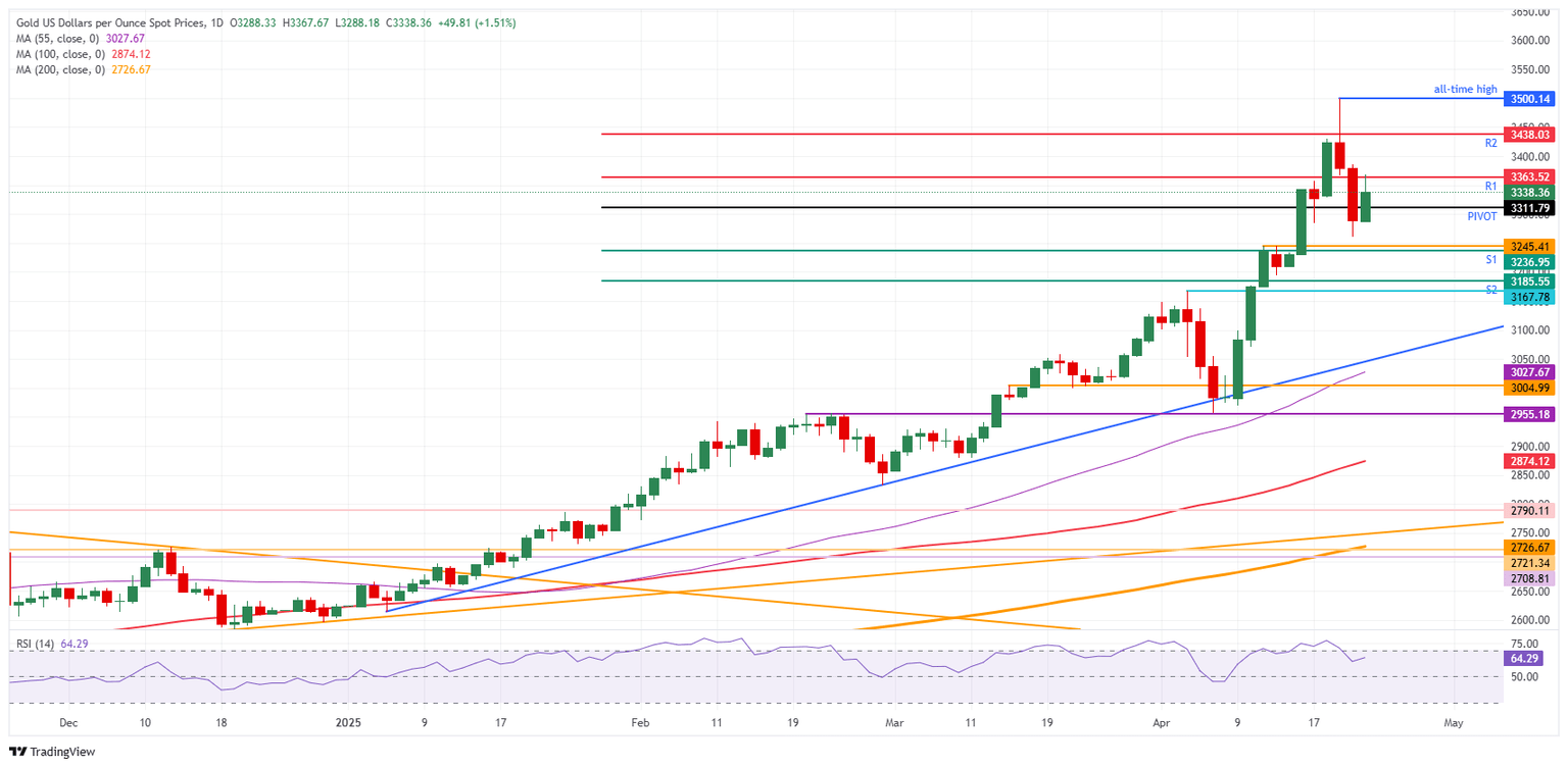 Gold price (XAU/USD) recovers from a two-day decline and traders around $3,335 at the time of writing on Thursday after two days of firm selling pressure since it topped at $3,500 on Tuesday. United States (US) President Donald Trump released more comments from the Oval Office late Wednesday, signaling that China may receive a new tariff rate in the next “two to three weeks” while countries that are currently in the negotiation phase might see reciprocal tariffs come in if negotiations are not going the way Trump wants, Bloomberg reports. Meanwhile China has responded by saying it will not come to the negotiation table if first the tariffs are not lifted, before negotiations can even take place.