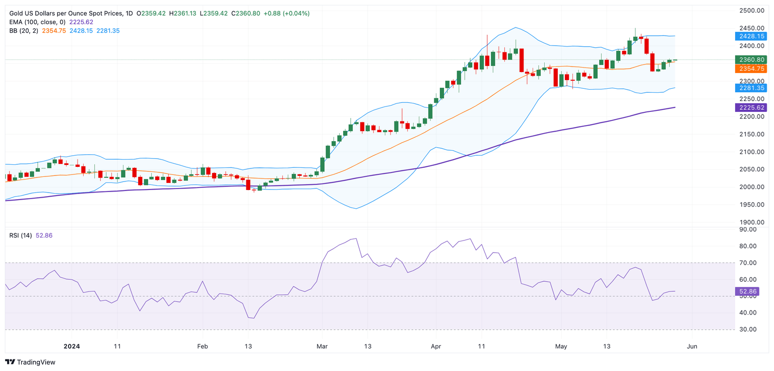 On the flip side, a low of May 24 at $2,325 acts as an initial support level for XAU/USD. The next contention level is seen at the $2,300 round mark. Any follow-through selling below this level will expose the lower limit of the Bollinger Band at $2,277, followed by the 100-day EMA of $2,222.