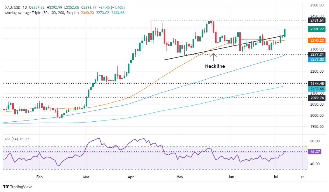 Gold price has decisively broken the Head-and-Shoulders neckline, lifting spot prices near the $2,390 mark, indicating that bulls are in charge and higher prices lie ahead.
