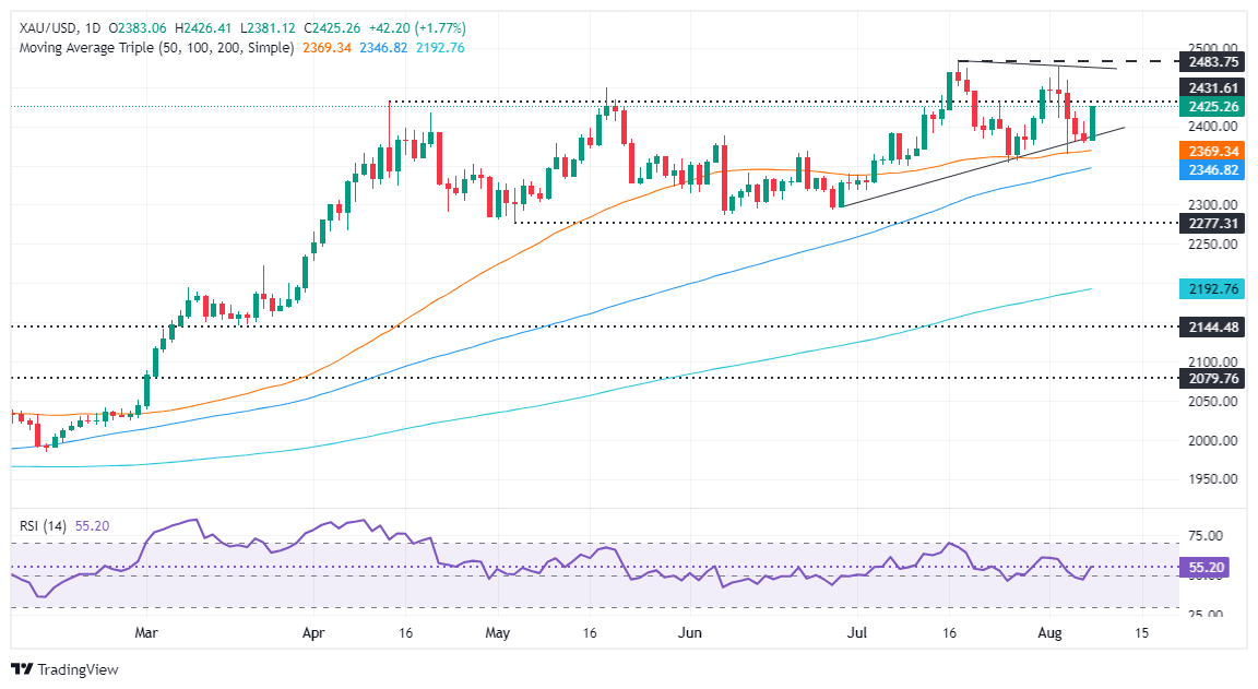 The XAU/USD rallies sharply, breaking new weekly highs of $2,424, with buyers eyeing the psychological $2,450 level mark. The Relative Strength Index (RSI) shows buyers are gathering momentum, meaning higher prices are on the cards.