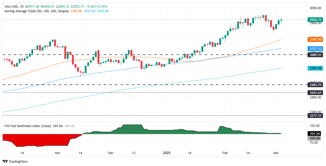 Gold price remains firm on Wednesday amid speculation that the President of the United States (US), Donald Trump, could roll back some tariffs, at least duties on automobiles linked to the USMCA free trade agreement. Nevertheless, uncertainty remains, and XAU/USD trades at $2,919, virtually unchanged.