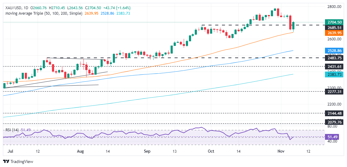 Gold rebounded at around the 50-day Simple Moving Average (SMA) at $2,639 and aimed towards $2,700, but buyers lacked the strength to push prices higher. The first key resistance area for bulls would be $2,700. If cleared, the next stop would be the 20-day SMA at $2,716, ahead of $2,750, followed by October 23 high at $2,758.