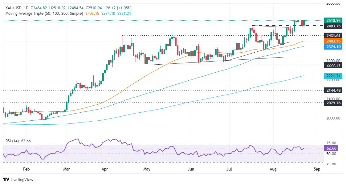 Gold price edges up over 1% on Friday as the Greenback and US Treasury bond yields dive following dovish remarks from Federal Reserve Chair Jerome Powell, who signaled he’s confident that inflation is edging towards the 2% goal and that rates should be cut. The XAU/USD trades at $2510 after bouncing off daily lows of $2484.