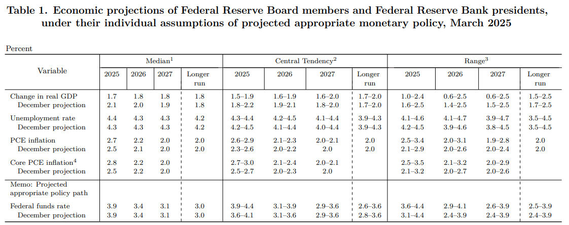 - The Summary of Economic Projections (SEP) revealed that Fed officials anticipate two rate cuts in 2025, keeping the fed funds rate forecast at 3.9%, unchanged from December’s projections. The PCE Price Index — the Fed’s preferred inflation gauge — and the Unemployment Rate were revised higher, while GDP growth is now projected to fall below 2%, signaling a slowdown linked to President Donald Trump’s trade policies.