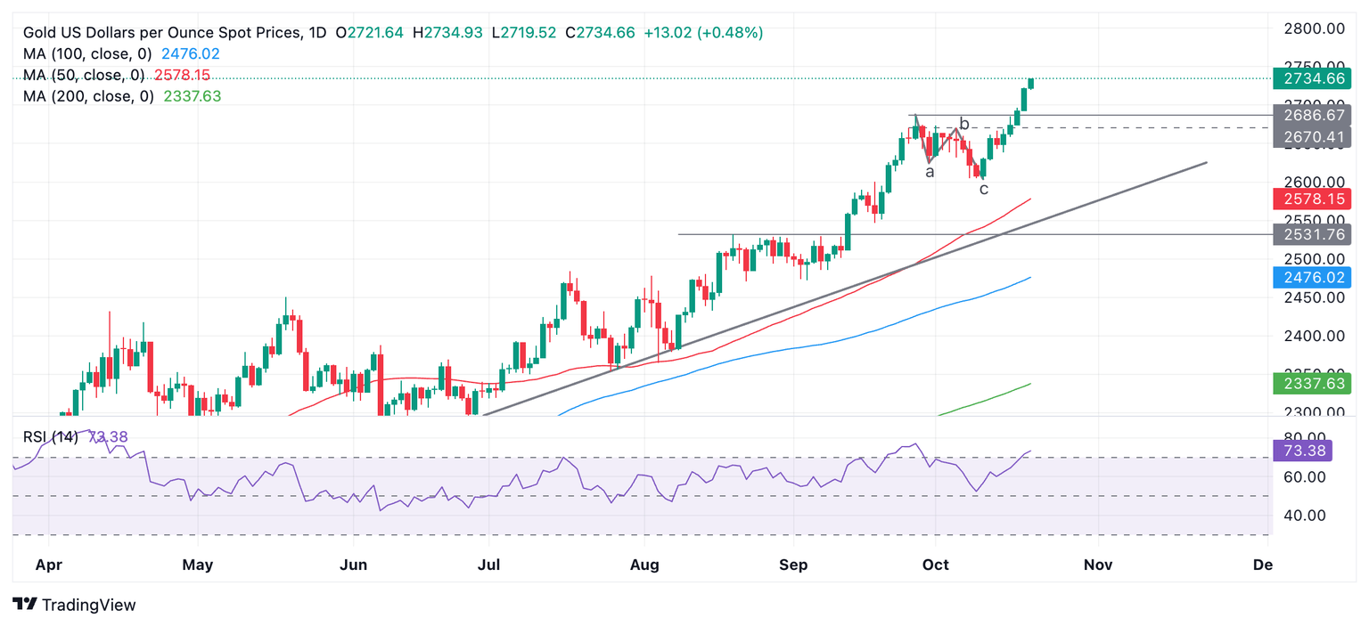 - XAU/USD continues trending higher as it pushes deeper into territory above $2,700.