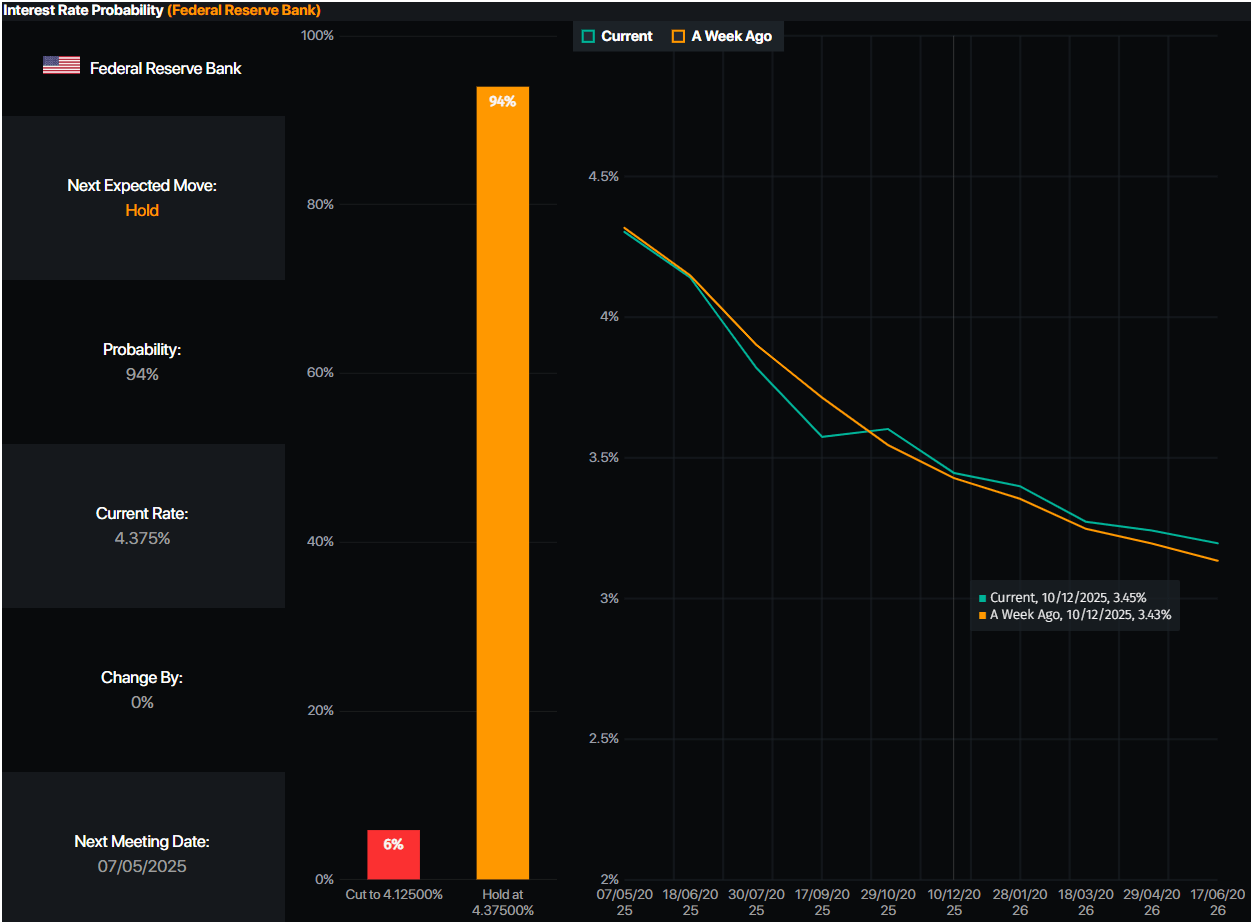 Regarding the chances of the Federal Reserve reducing interest rates at the upcoming meeting, traders see a 94% chance of keeping them unchanged, according to Prime Market Terminal. Nevertheless, traders expect the Fed funds rate to end at 3.45%, equal to 92 basis points of easing (bps).