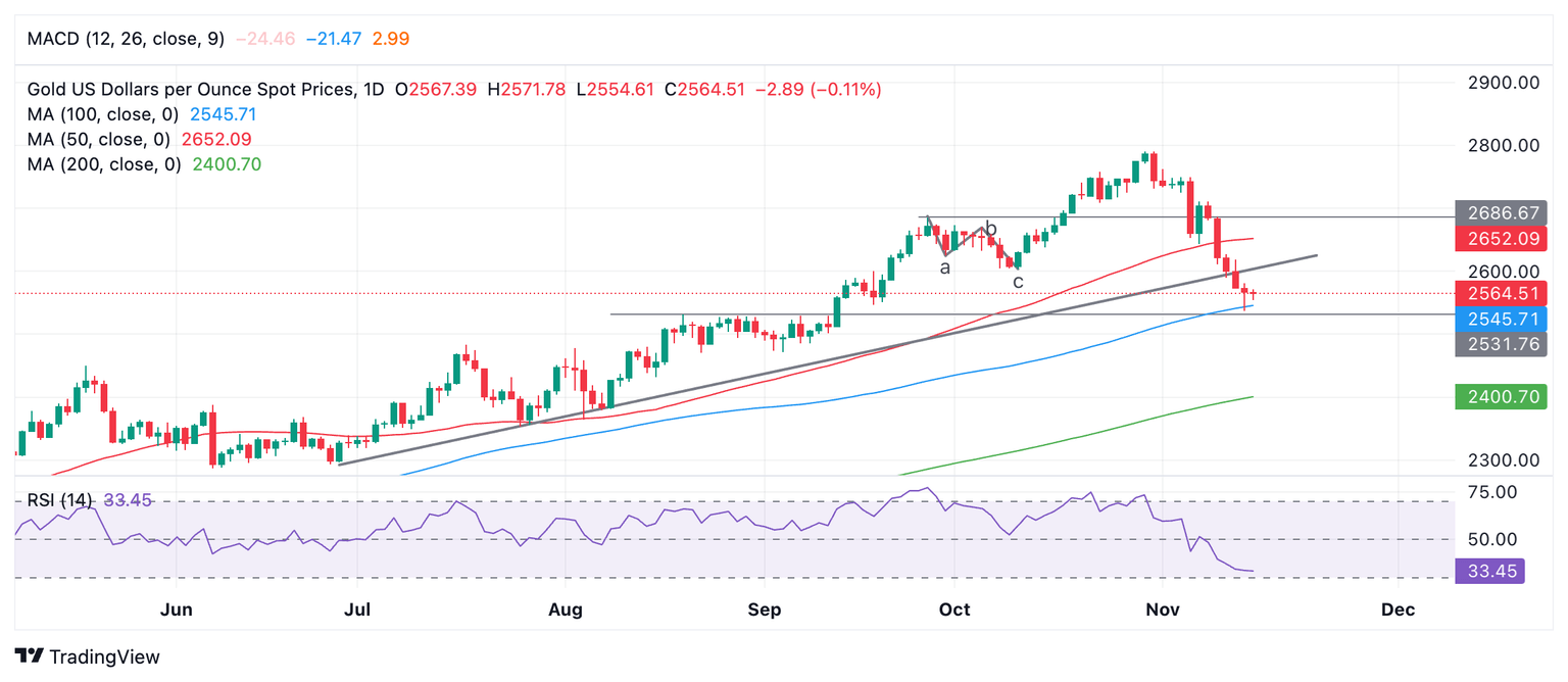 Gold extended its decline, breaking below a major trendline and reaching new lows in the $2,530s on Thursday, after a combination of higher US factory-gate inflation data, lower US unemployment claims data and upbeat commentary from Fed Chairman Powell.