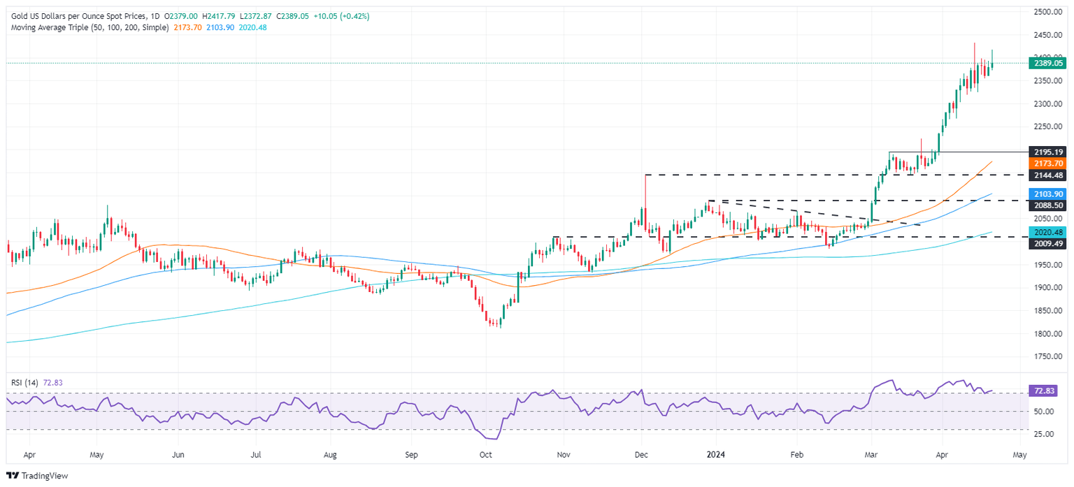 That said, XAU/USD's first resistance would be $2,400, followed by Friday’s high of $2,417. A breach of the latter will expose the all-time high of $2,431. On the other hand, if XAU/USD is headed for a correction, the first support would be the $2,350 mark, followed by the April 15 daily low of $2,324. Once surpassed, Gold might test $2,300.