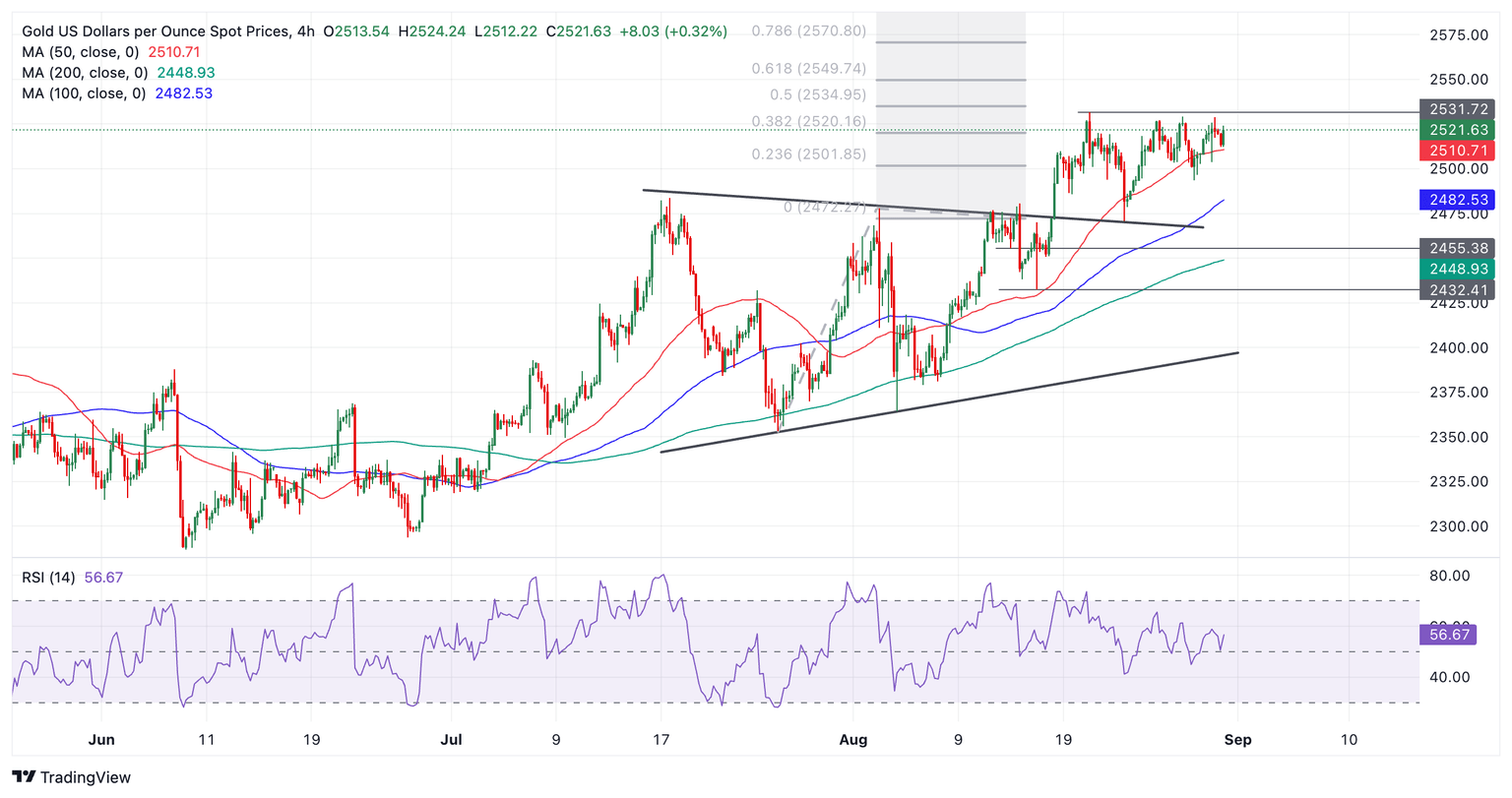 A break above the $2,531 August 20 all-time high would provide confirmation of a continuation higher towards the $2,550 target.
