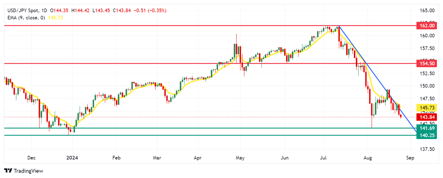 USD/JPY trades around 143.90 on Friday. Analysis of the daily chart shows that the pair is positioned below a downtrend line, suggesting a bearish bias. However, the 14-day Relative Strength Index (RSI) remains slightly above 30, indicating that the bearish trend may continue.