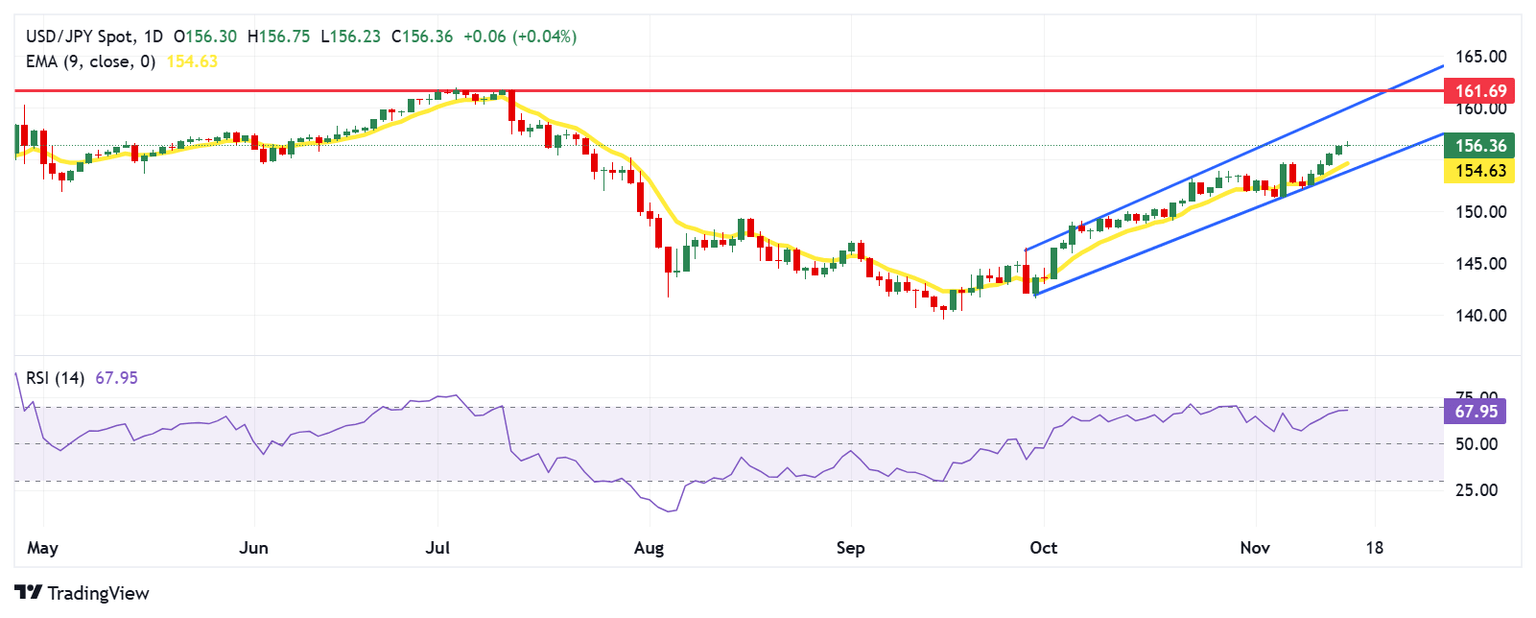 USD/JPY trades around 156.50 on Friday. Daily chart analysis shows a continued bullish bias, with the pair moving upwards within an ascending channel pattern. The 14-day Relative Strength Index (RSI) is just below the 70 level, supporting the bullish outlook. A breakout above the 70 mark would indicate an overbought condition, potentially leading to a downward correction for the pair.