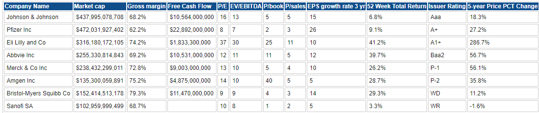JNJ trades on a P/E of 16, which looks a little high compared to Pfizer (PFE), but JNJ does offer a more broad-based consumer exposure, which usually trades on a higher multiple.