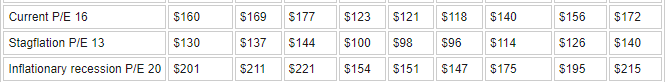 What we are looking at here is stability. This is not high-growth, home-run investing. This is not Tesla or Netflix. This is a long-term stable business that also pays a dividend of just under 3%. Now looking again at our revenue and margin outcomes, for the next 12 months we are entering an inflationary recession in my view. That leads to a P/E of between the current 16 and 20.