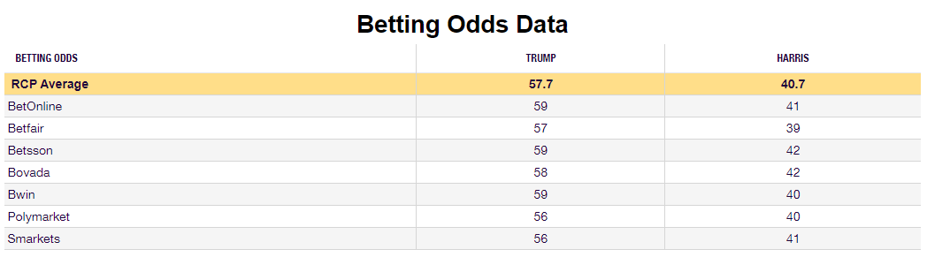 Although US presidential election betting odds should not be taken as a representative view of US voters, they might still trigger a reaction in financial markets. Unlike PredictIt, RealCelarPolling's average for betting odds currently has Trump with at a comfortable lead against Harris, 57.7 vs 40.7.