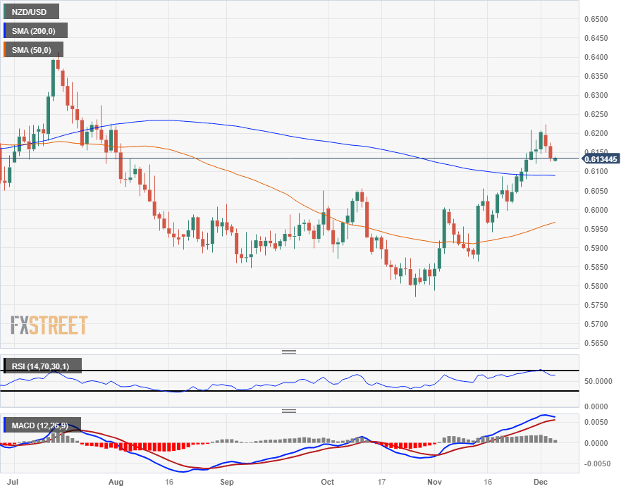 The Kiwi has backslid straight into the 200-hour Simple Moving Average (SMA) near 0.6130, and intraday price action is set to get hung up near the price level with exposure risk tilting firmly to the downside as the 50-hour SMA turns bearish into 0.6160, capping off upside bids.