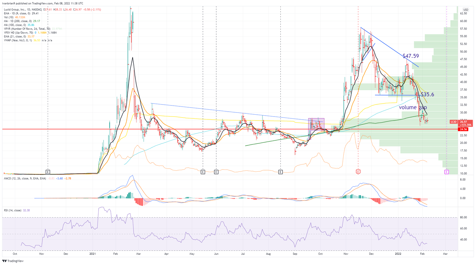 We had identified $30 as the likely target once momentum started to fail and yields began to rise. We do not see that situation changing anytime soon and note that yields and sentiment continue to move against high growth names. LCID has broken below the 200-day moving average at $29.17, and the 9-day moving average is about to cross below the 200-day. This is strongly negative and should lead to more losses. The only positive is the amount of historic volume at current levels. the point of control is $24.56: see the large volume profile bars on the chart below. Volume generally means equilibrium, so any further losses are likely to be more steady.