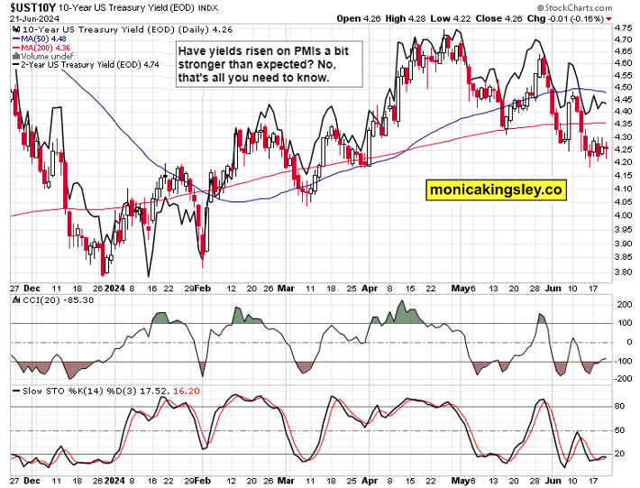 S&P 500 gyrated as befits quad (triple) witching, but what has changed? Did higher for longer odds go up on PMIs coming in slightly above expectations? Not really, the odds of no cut in Sep are still comfortably low at 34%. While not exactly soft landing supportive, did it force any move to speak of, even on the short end of the curve? Look at the no rally chart below, and then at the troubled, troubling, place your adjective of choice, market breadth in the S&P 500.