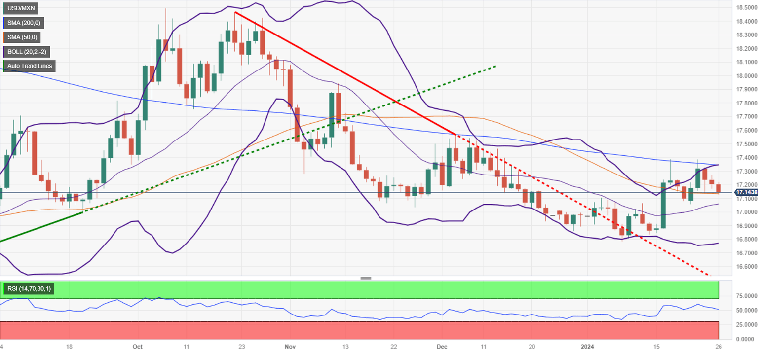 The USD/MXN has accelerated to the downside after printing losses for three straight days, but it continues to exchange hands above strong support from the 50-day Simple Moving Average (SMA) at 17.13. A breach of the latter will expose the January 22 low, followed by the 17.00 psychological figure.