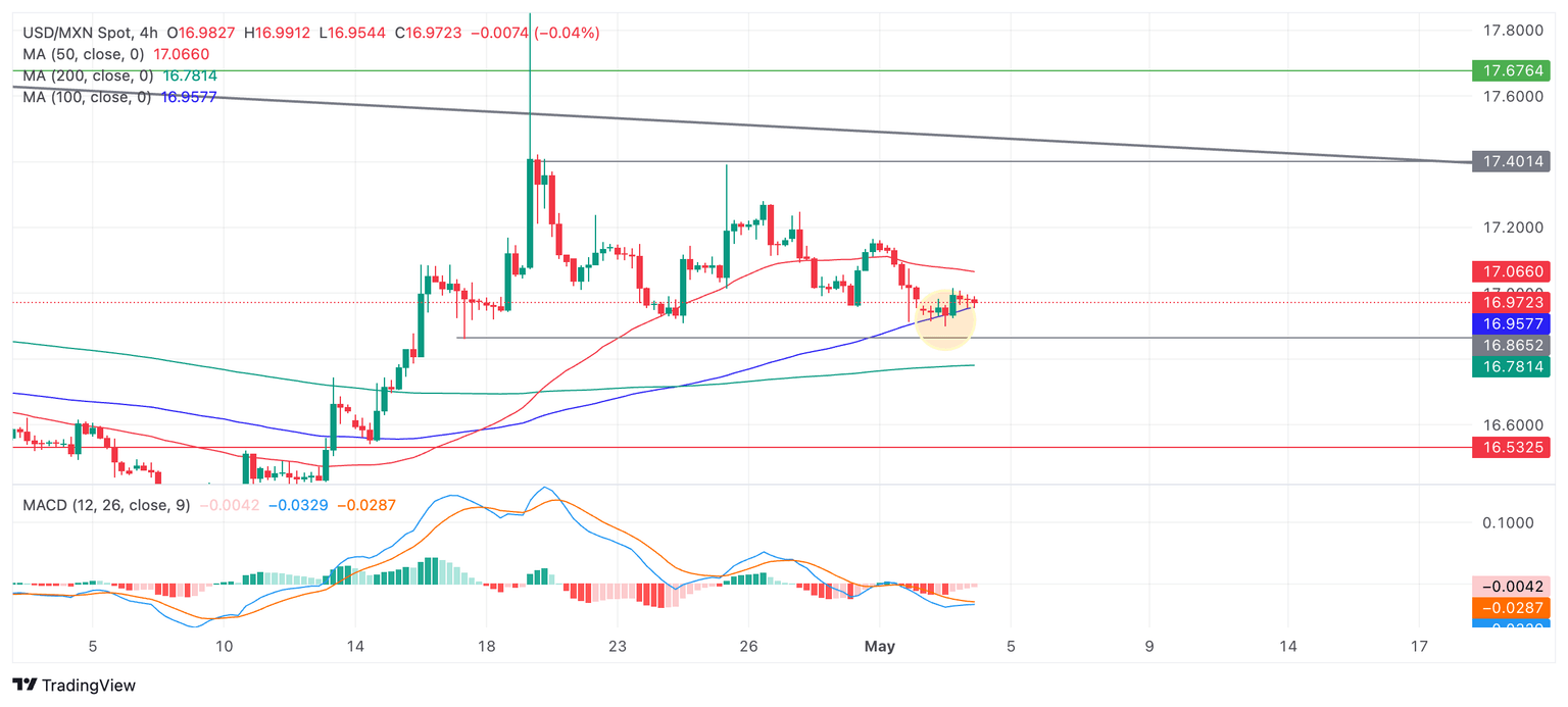 More upside could take the USD/MXN up to the 50 Simple Moving Average (SMA) on the 4-hour chart at 17.07, followed by the lower high at 17.15. A clear break above the zone of resistance around 17.15-17.18 might see further gains up towards the range highs again.