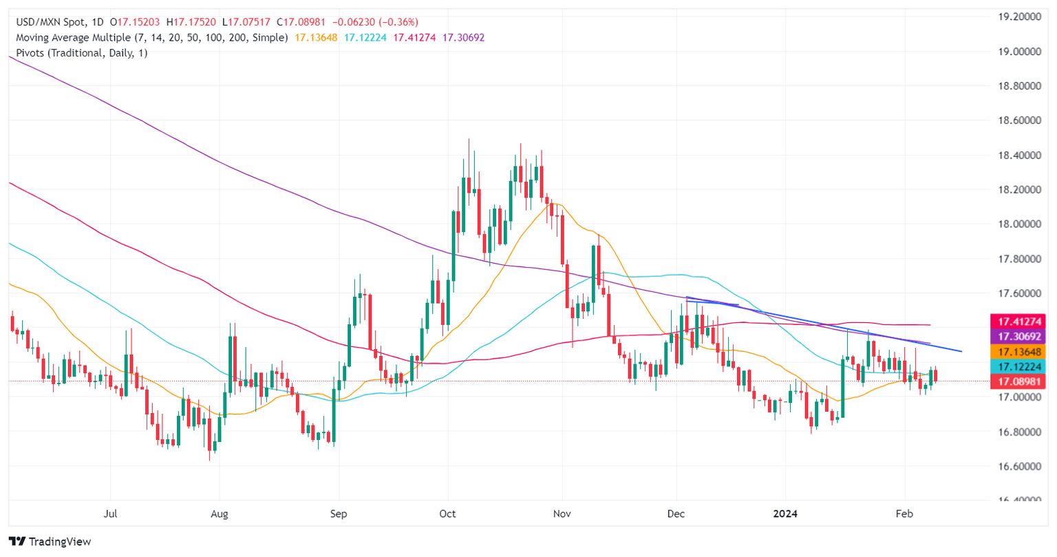 Mexican Peso (MXN) appreciated against the US Dollar (USD), set to finish the week with gains of 0.31%. Data from the United States (US) confirmed the downtrend on inflation remains in place, which could open the door for the US Federal Reserve (Fed) to lower interest rates toward the second half of the year. The USD/MXN is trading at 17.09, on the daym reflecting a decline of 0.36%.