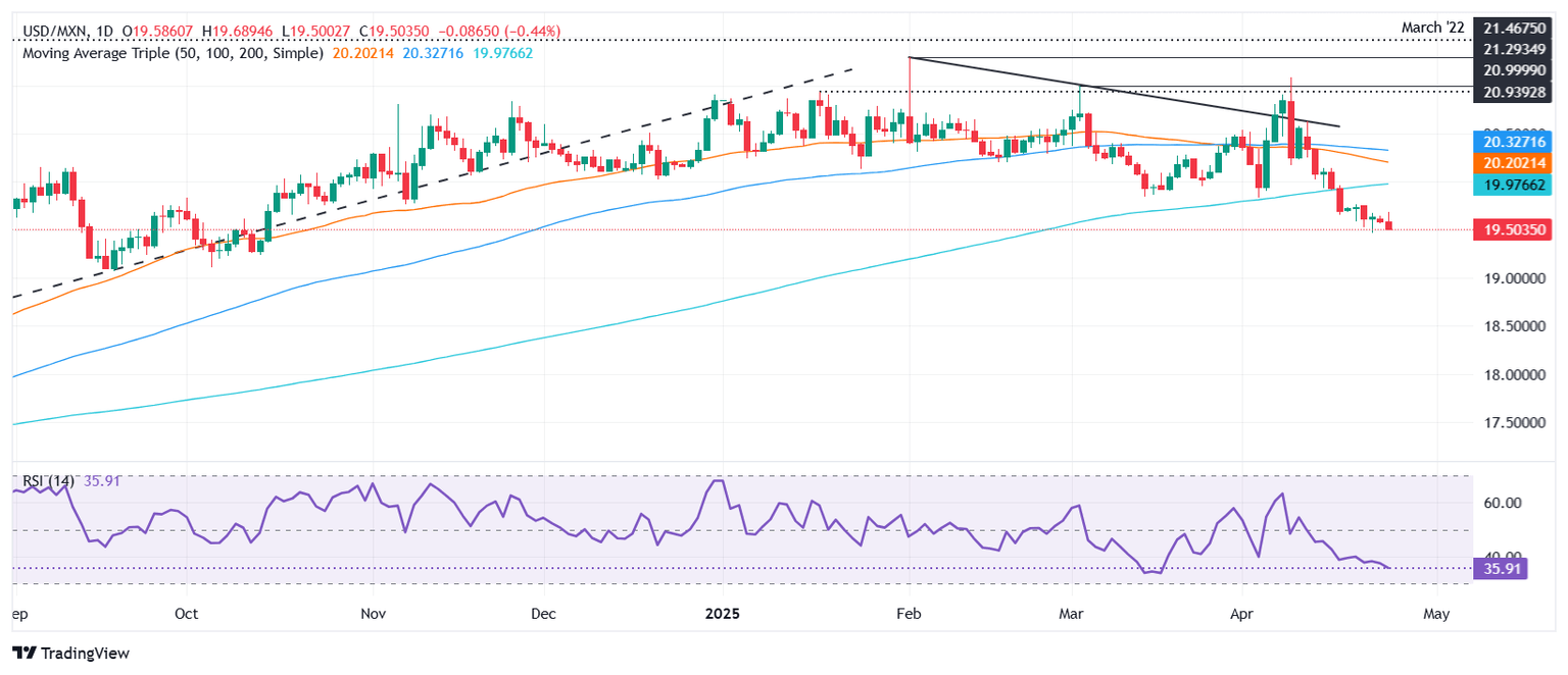 Price action suggests the USD/MXN is bearishly biased and might continue its downtrend, once it registers a daily close below 19.50. In that outcome, the next support would be 23’s low of 19.46, the current year-to-date (YTD) low, followed by the 19.00 psychological figure.