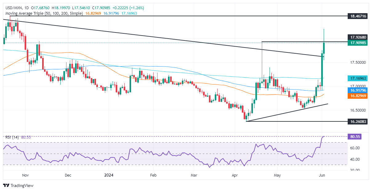Technical analysis: Mexican Peso depreciates as USD/MXN rallies above 17.90