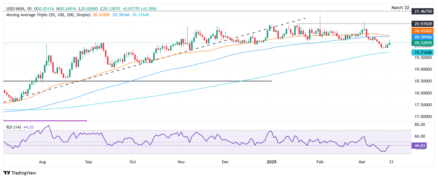 USD/MXN bounced off yearly lows reached on March 14 at 19.84, though it faces stiff resistance at the 100-day Simple Moving Average (SMA) at 20.35.