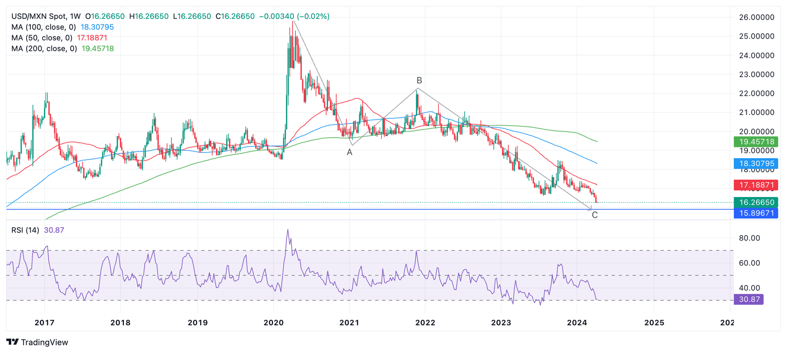 USD/MXN has quickened the pace of its long-term downtrend. The trend started after the pair peaked at 25.76 in April 2020 – it has now fallen to the 16.20s. Since “the trend is your friend,” it is likely to extend.