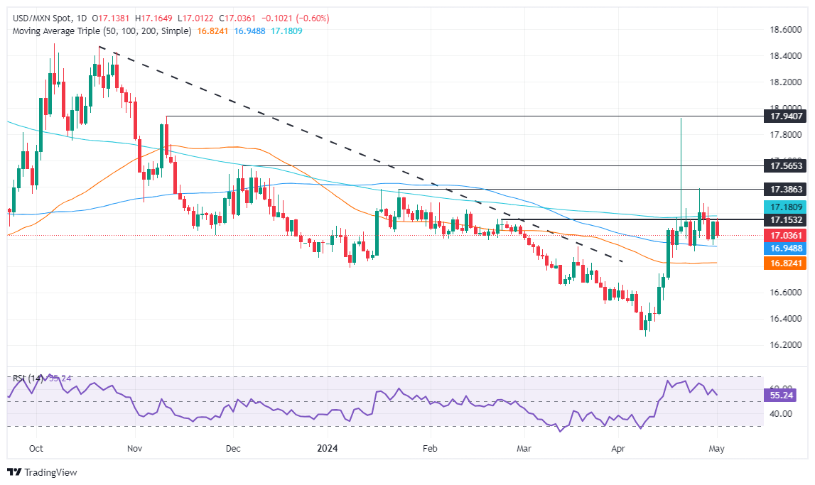 The Mexican Peso rallied sharply against the US Dollar on Wednesday after the Federal Reserve decided to hold rates, but also opened the door to reducing the Quantitative Tightening program, beginning in June. At the time of writing, the USD/MXN trades at 16.98, down more than 0.80%.