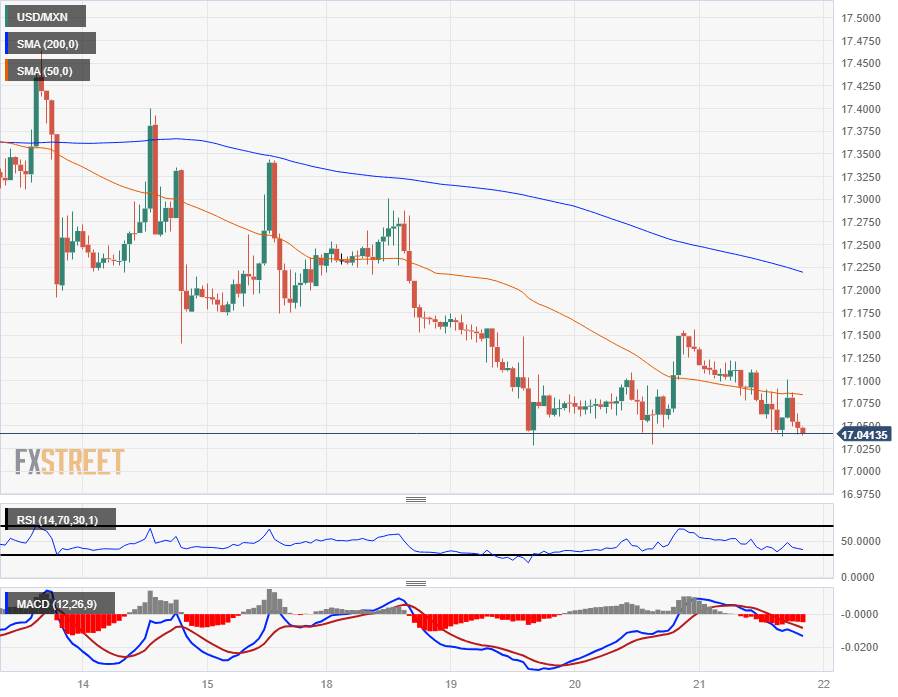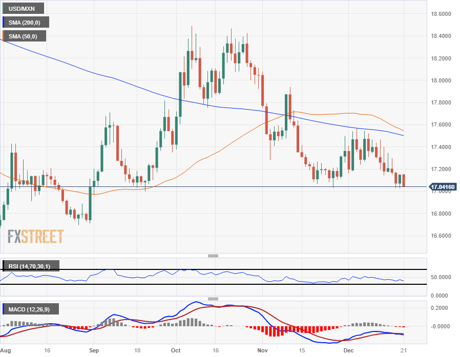 The Mexican Peso (MXN) is pushing back into recent highs against the US Dollar, driving the USD/MXN pair back into the 17.05 neighborhood after etching in a fresh 12-week low of 17.02.