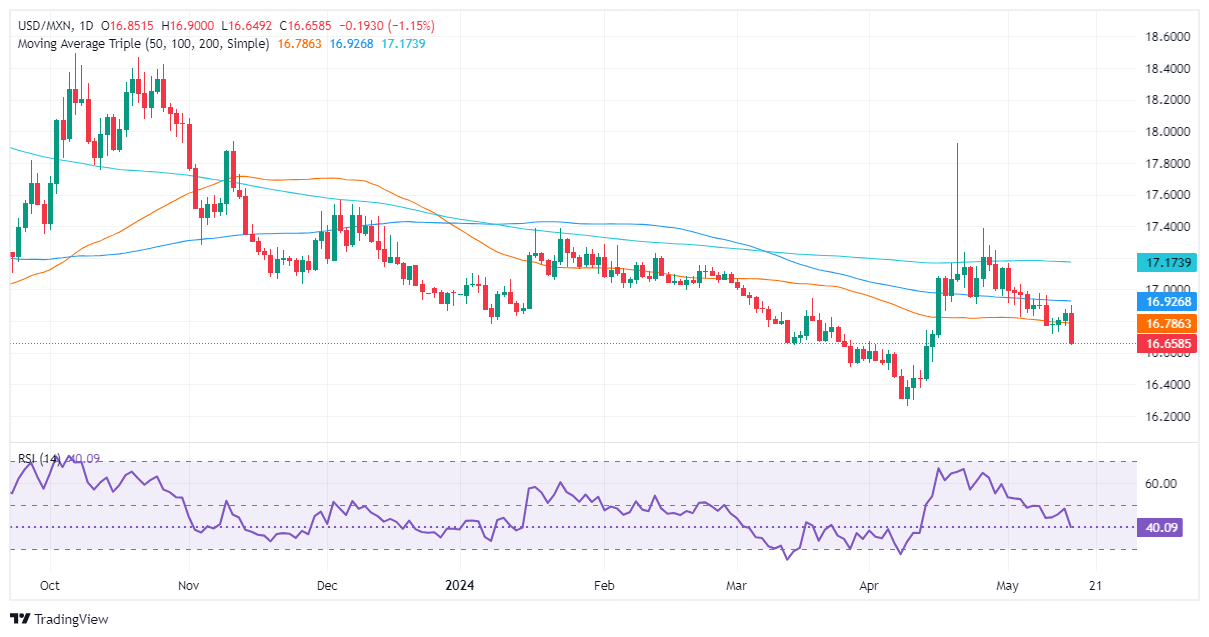 Following worse-than-expected US data, the USD/MXN extended its losses past the 16.70 figure. Momentum is on the side of the Mexican currency as the exotic pair has dropped to new four-week lows, poised to test the next support level seen at the 2023 low of 16.62, followed by the current year-to-date low of 16.25.