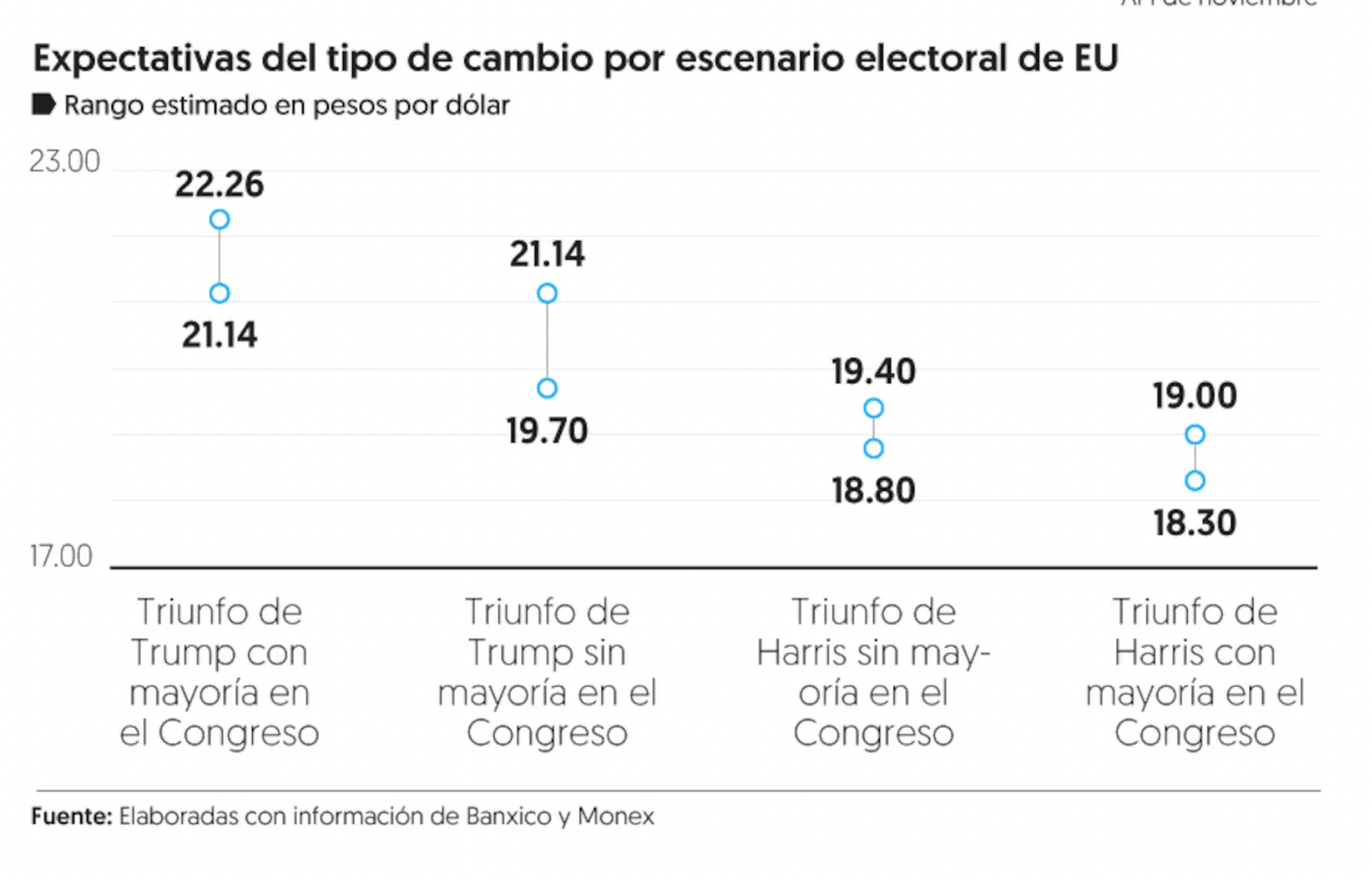 In the worst-case scenario of a Trump victory and a Republican majority in Congress, the Peso is likely to fall to between 21.14 and 22.26 to the US Dollar.