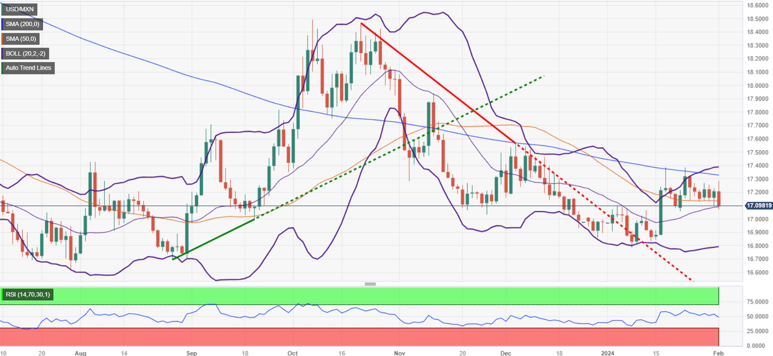 The USD/MXN remains trading sideways, but it has pierced below the 50-day Simple Moving Average (SMA) at 17.13, exposing the exotic pair to further losses. If sellers reclaim the January 22 daily low of 17.05, that could open the door to challenging the 17.00 figure.