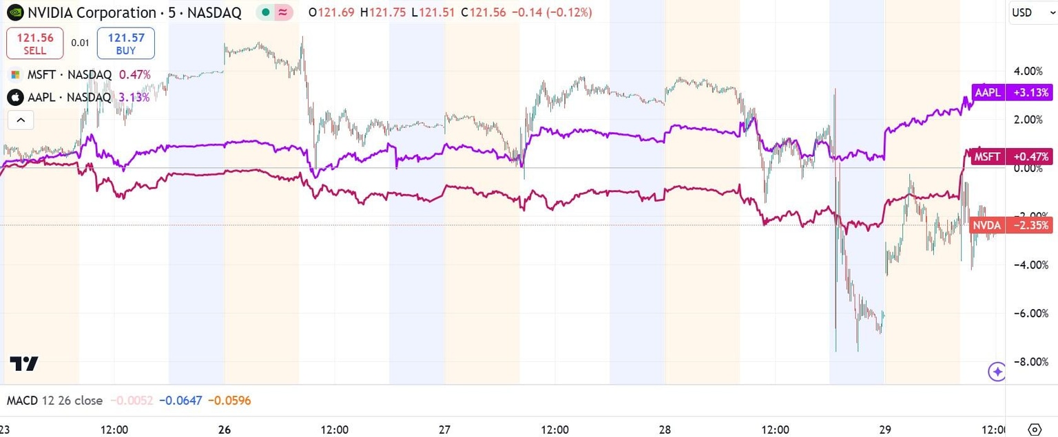 5-minute chart detailing peformance of NVDA, AAPL and MSFT over past five trading sessions