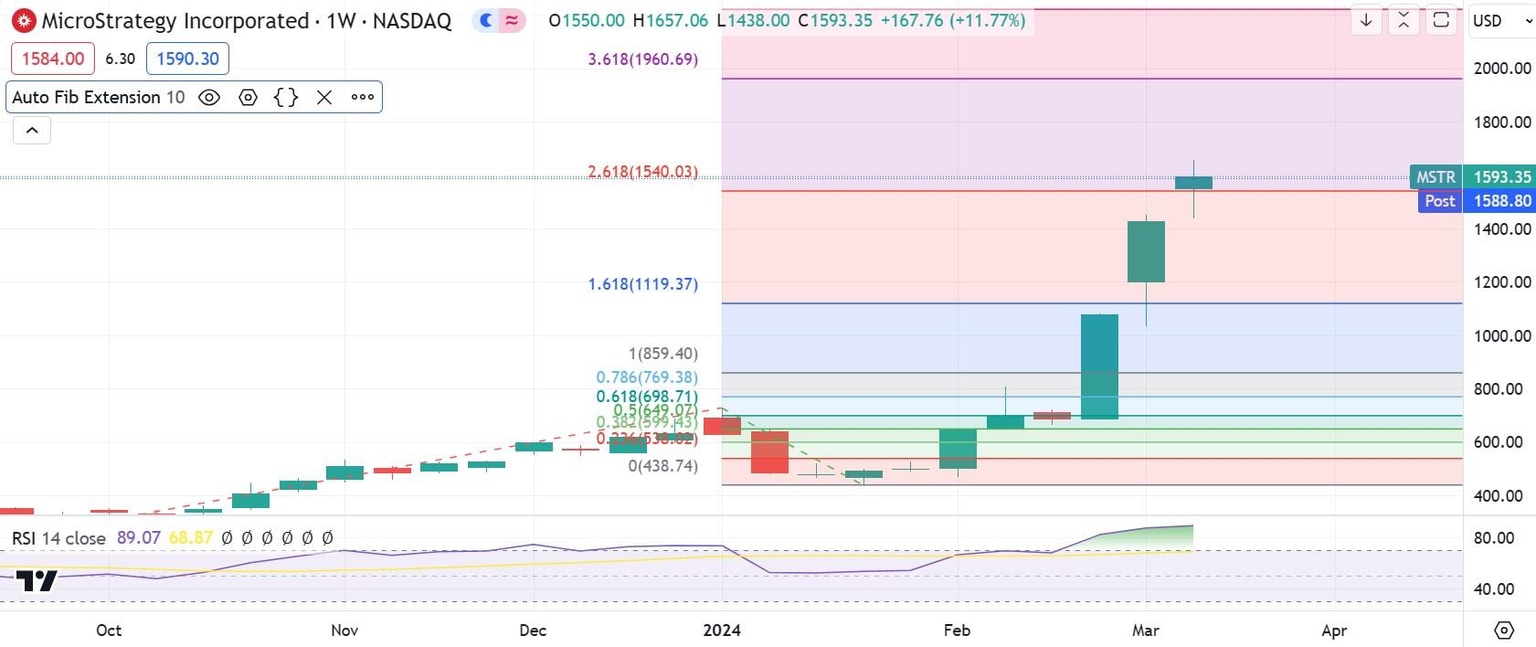 The weekly chart below, on the other hand, shows just where MSTR stock may go next. This week the share price is basing off the 261.8% Fibonacci at $1,540. If the market continues to treat this level as support for the rest of the week, then traders need to hold on for the 361.8% Fibonacci at $1,960.